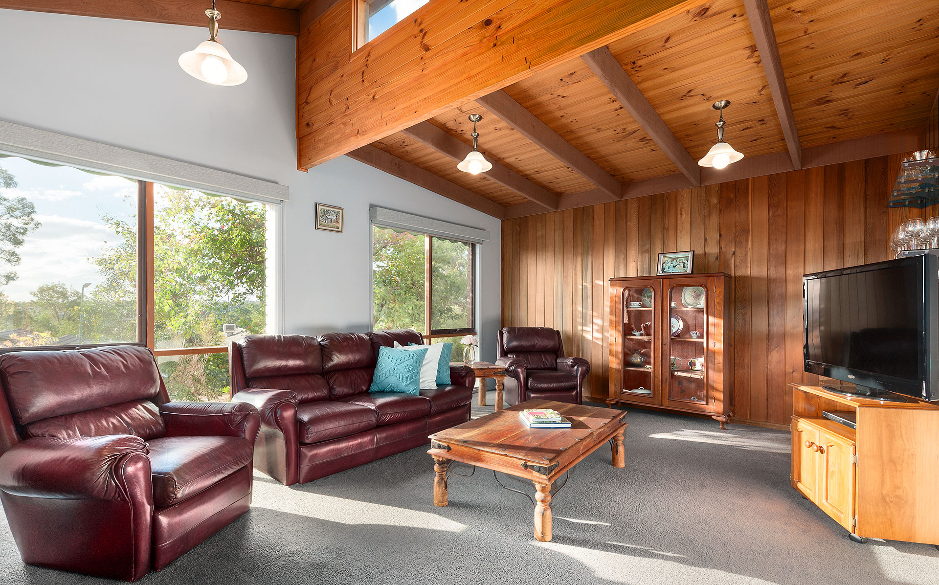 – Lounge with timber-lined cathedral ceilings and a built-in bar