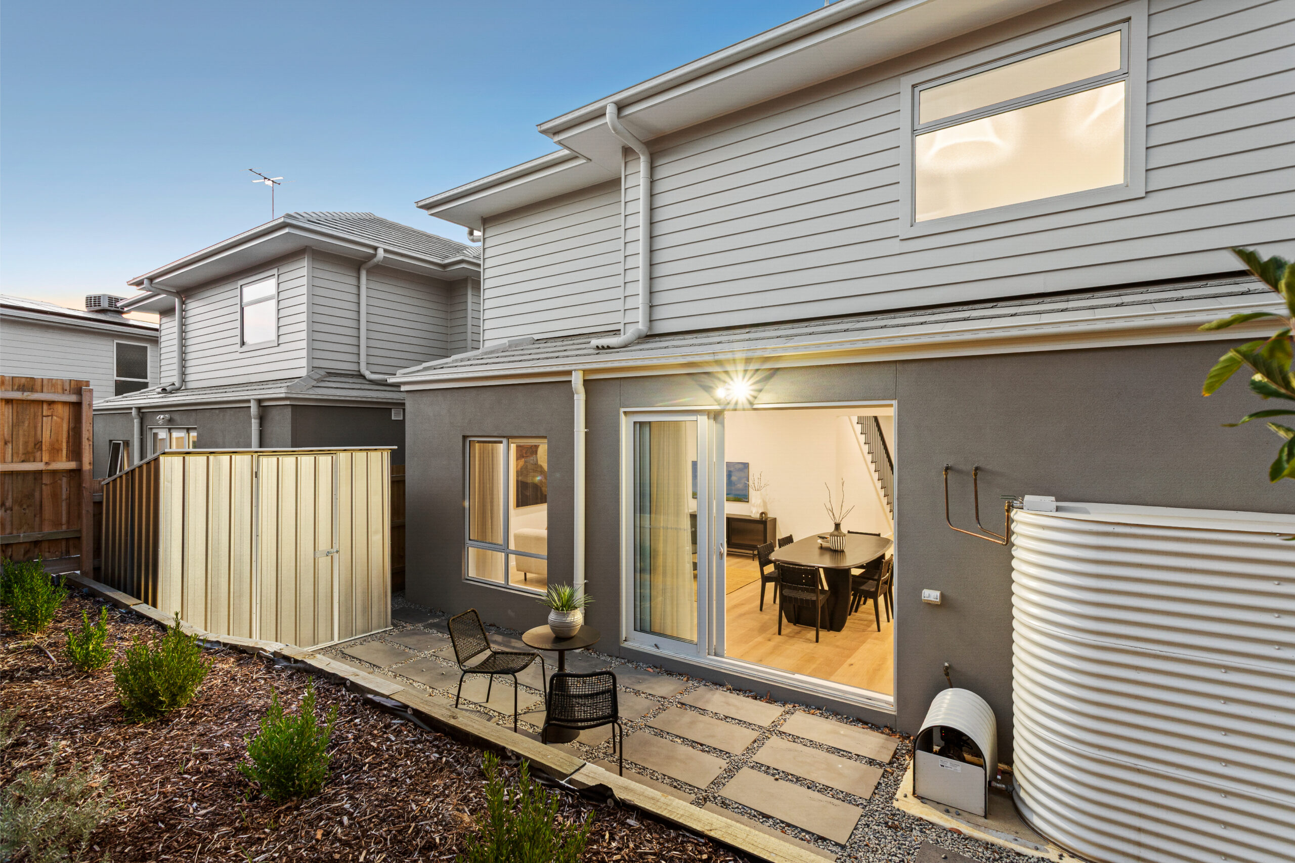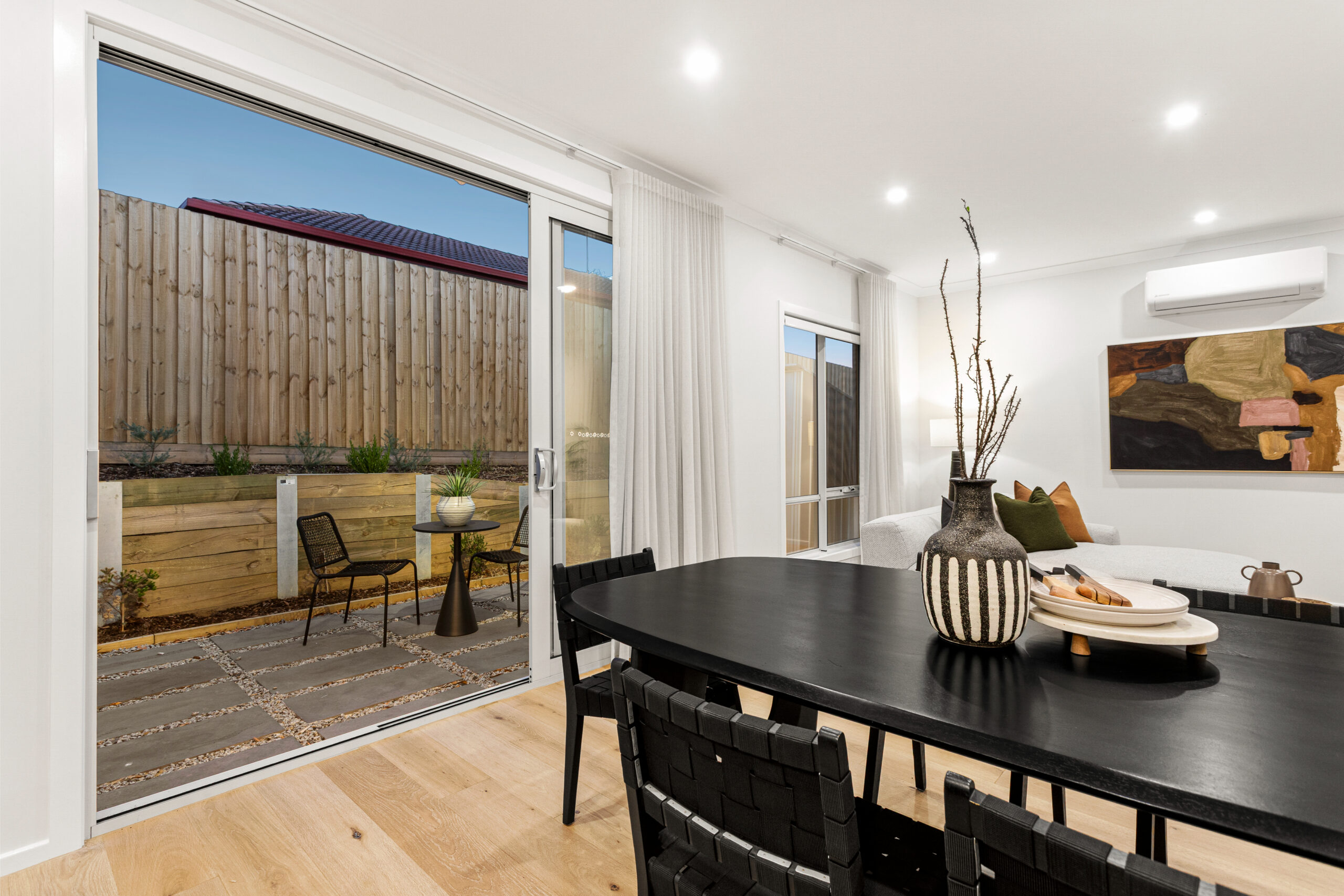 Sliding doors connect the interior to a low-maintenance rear yard, creating an inviting space for relaxed outdoor entertaining.