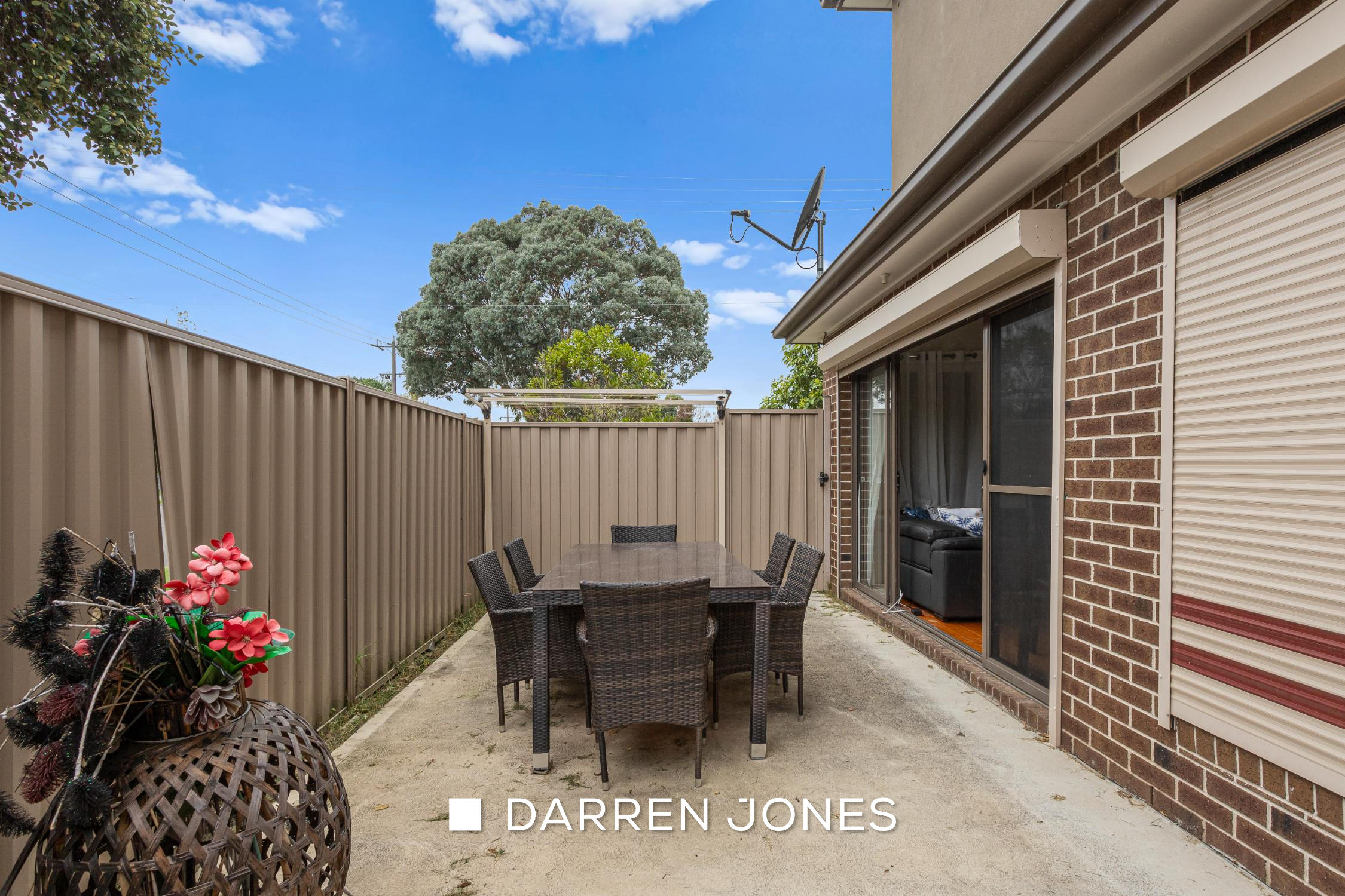 Stepping outside, the private yard offers a peaceful setting for relaxing or entertaining family and friends.