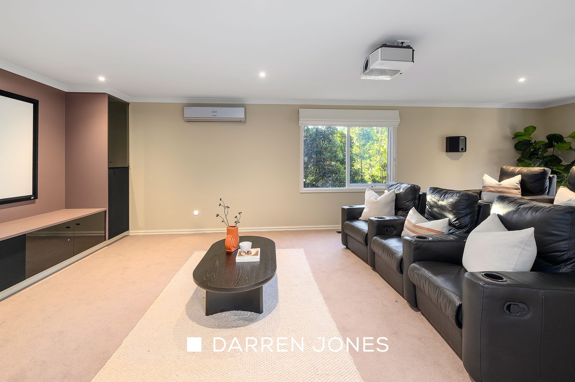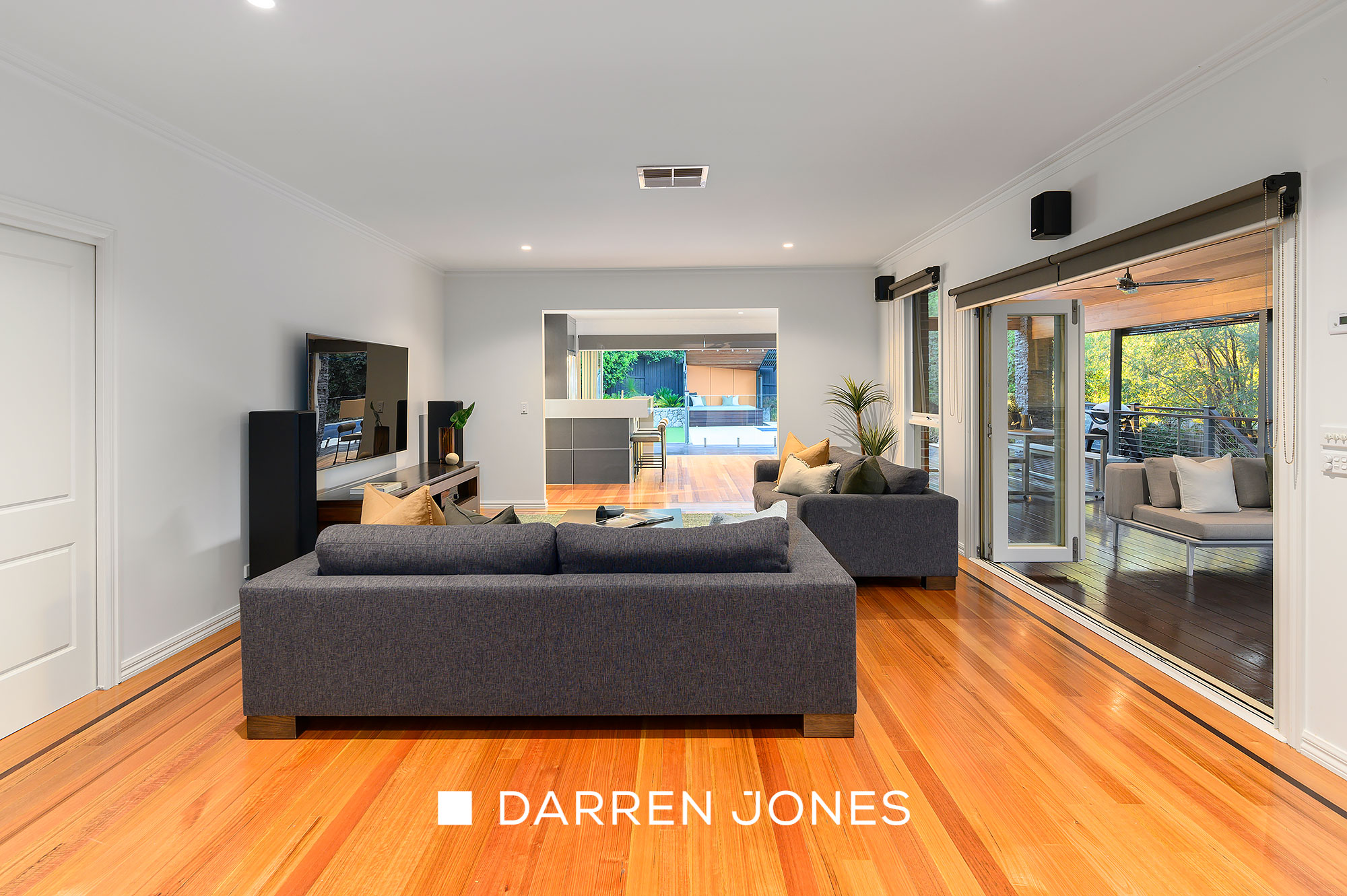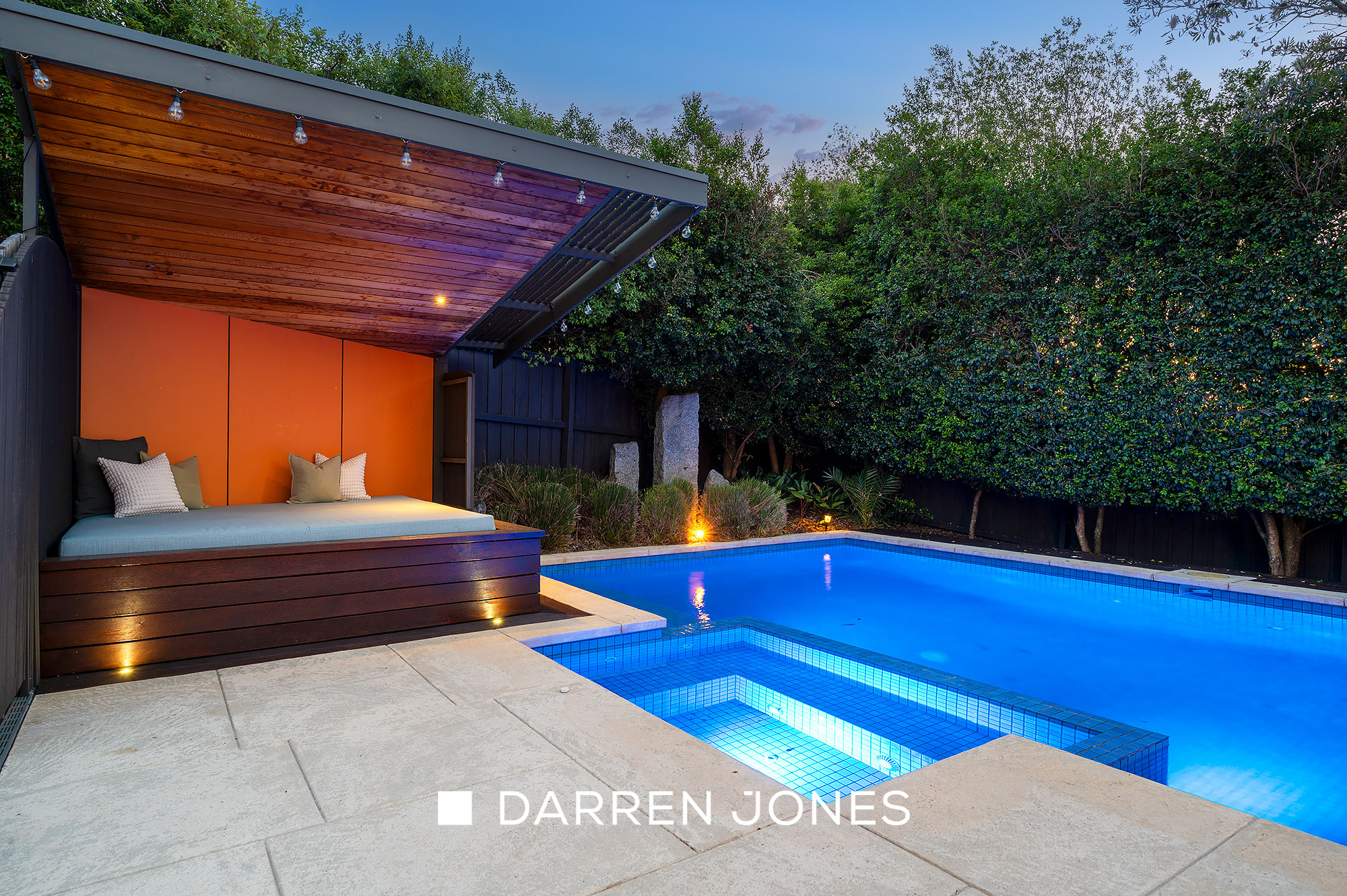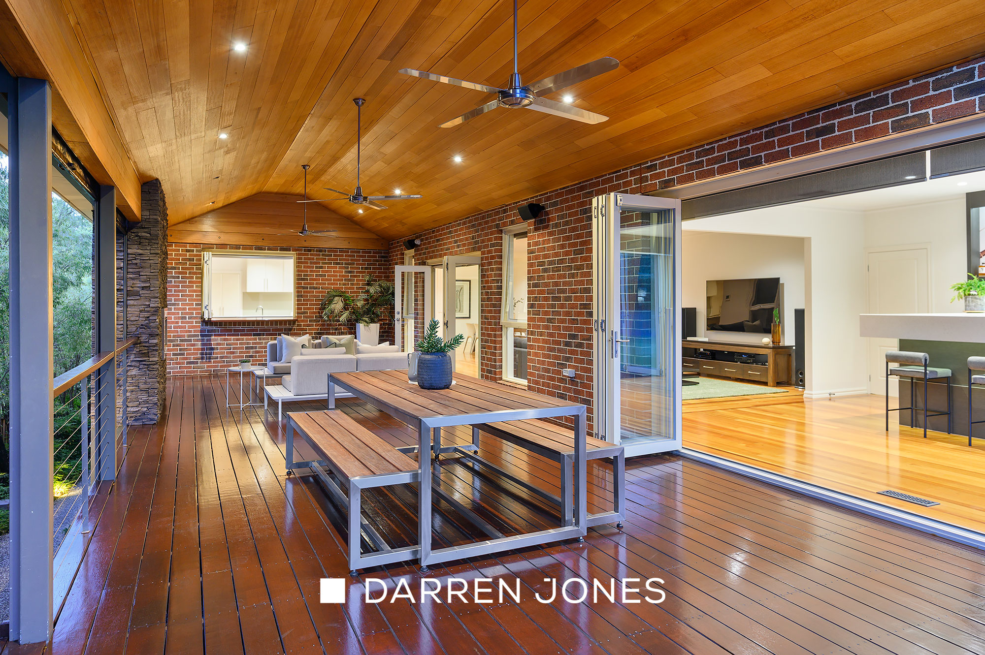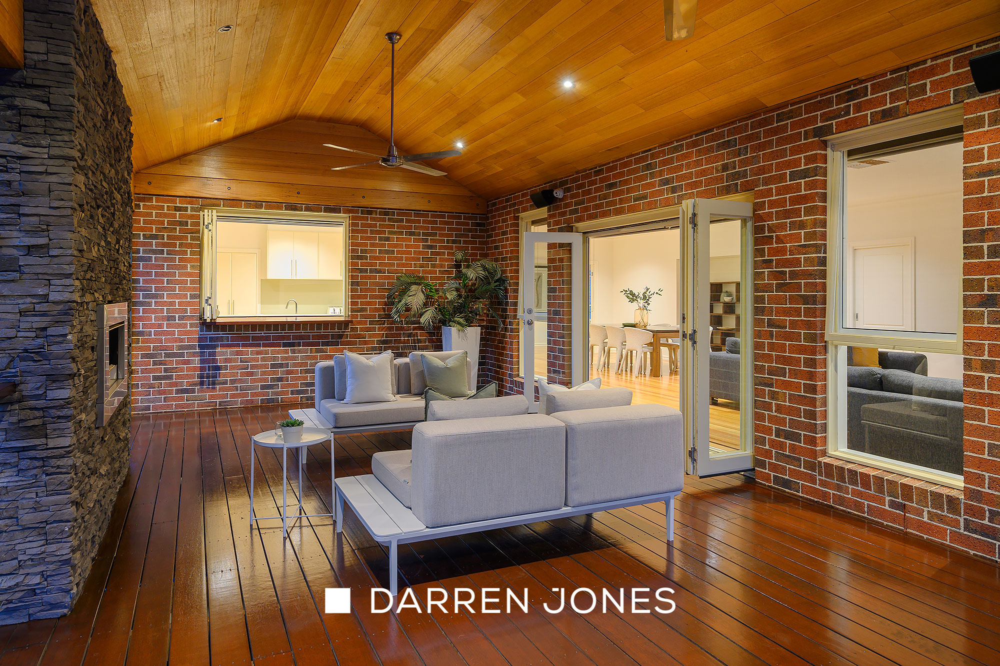 A wall of bifolds links this expansive area to an equally generous alfresco space. Roofed for year-round use and featuring speakers, fans, and a gas log fire, it is the focal point of a rear yard that includes a heated pool and spa, a gazebo with a day bed, and a putting area of no-mow turf under a basketball hoop.