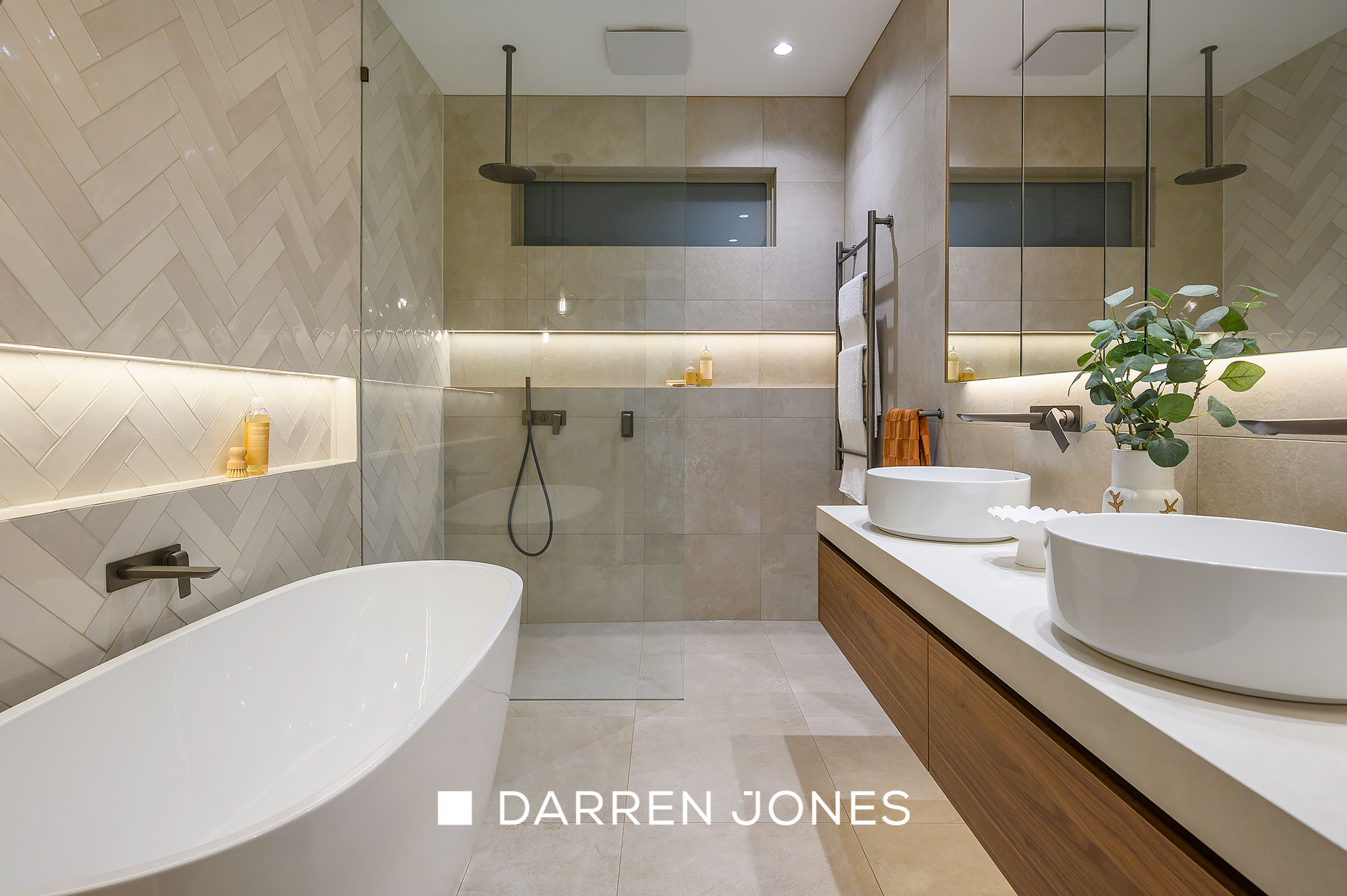 Accessed via stairs under a double-height entry, the first floor includes a main bedroom with a fully tiled, stone-detailed ensuite and three further bedrooms sharing an equally luxurious family bathroom.