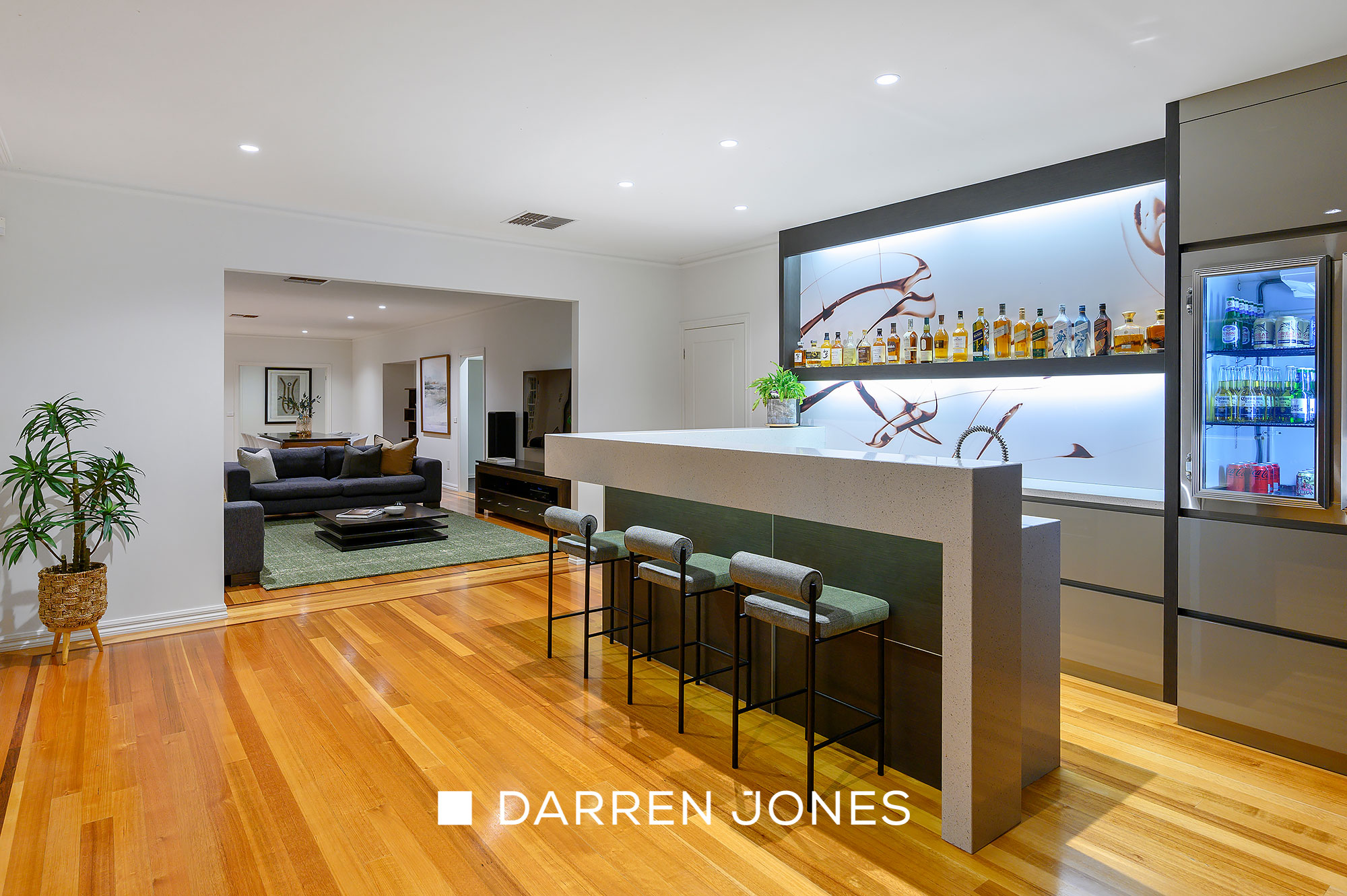 A spacious rumpus/retreat complements an expansive open-plan living and meals precinct. Anchored by a stone-detailed, 2-pac finished kitchen featuring Electrolux and Asko appliances, a walk-in pantry, and a servery window to the alfresco, it stretches out to a bespoke stone-finished bar area with commercial-grade refrigeration, a dishwasher, and an ice machine.